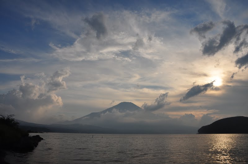 朝は湖面に映る逆さ富士と紅く焼けた富士を待っていたが残念。雲の中。